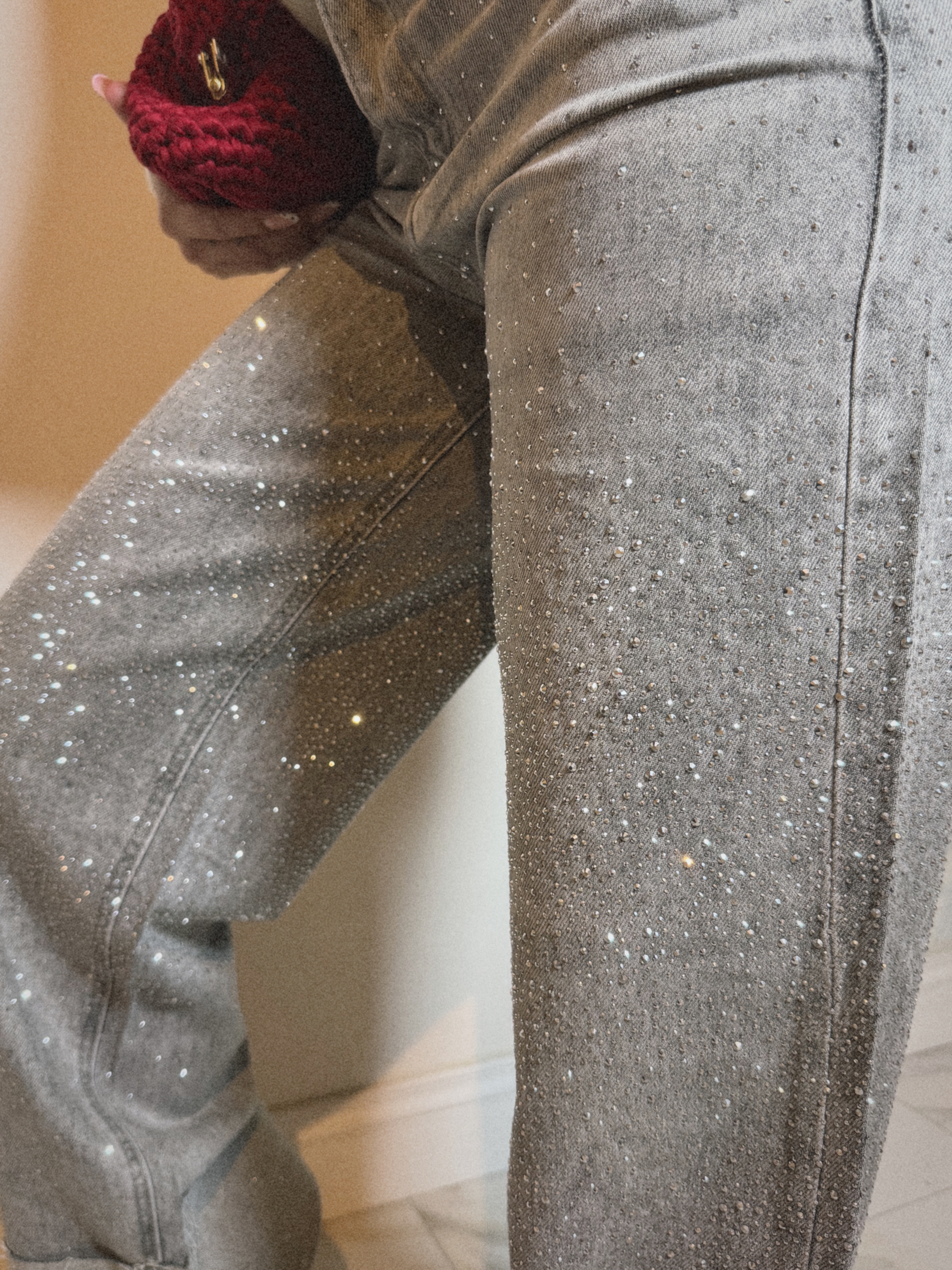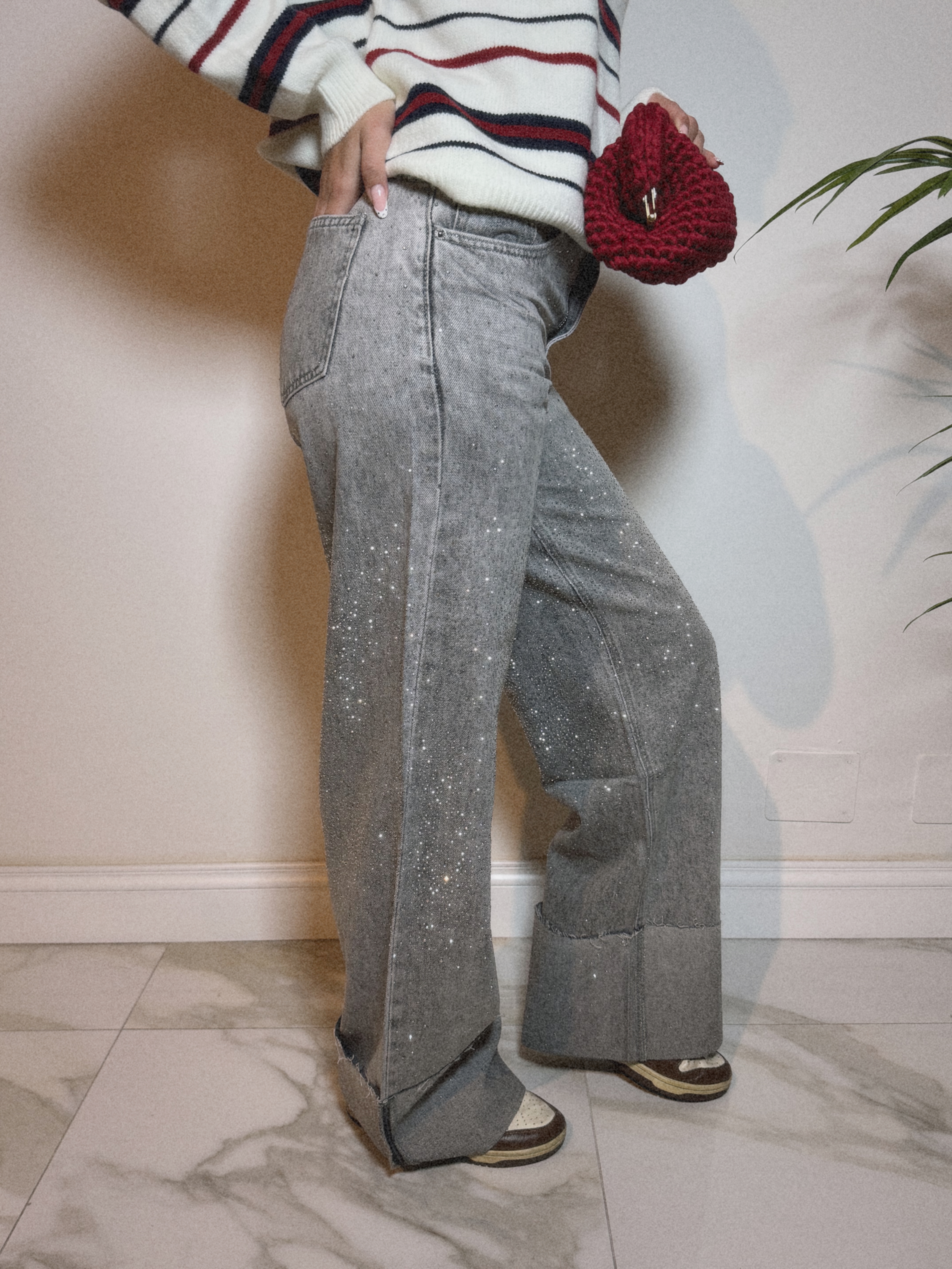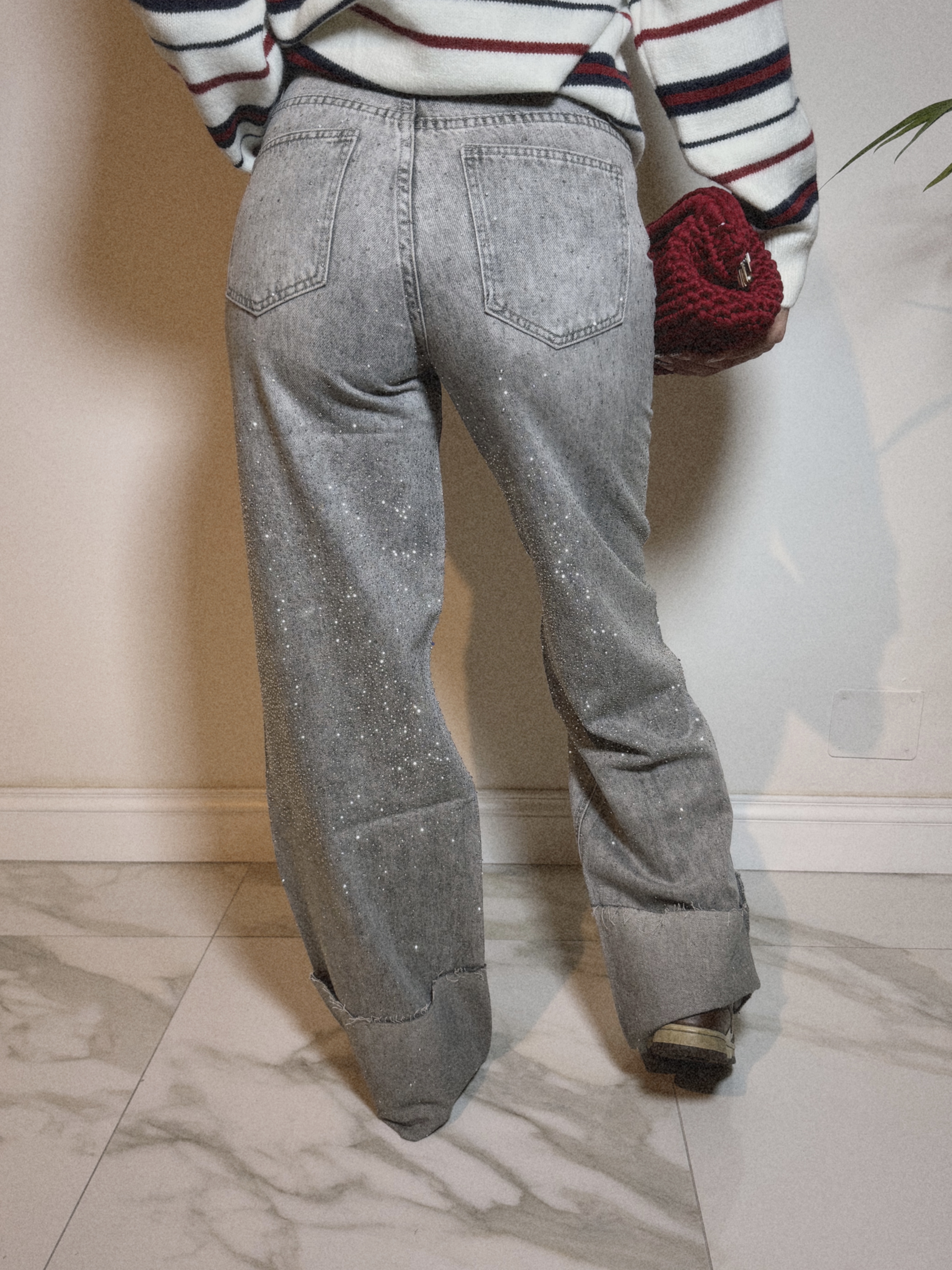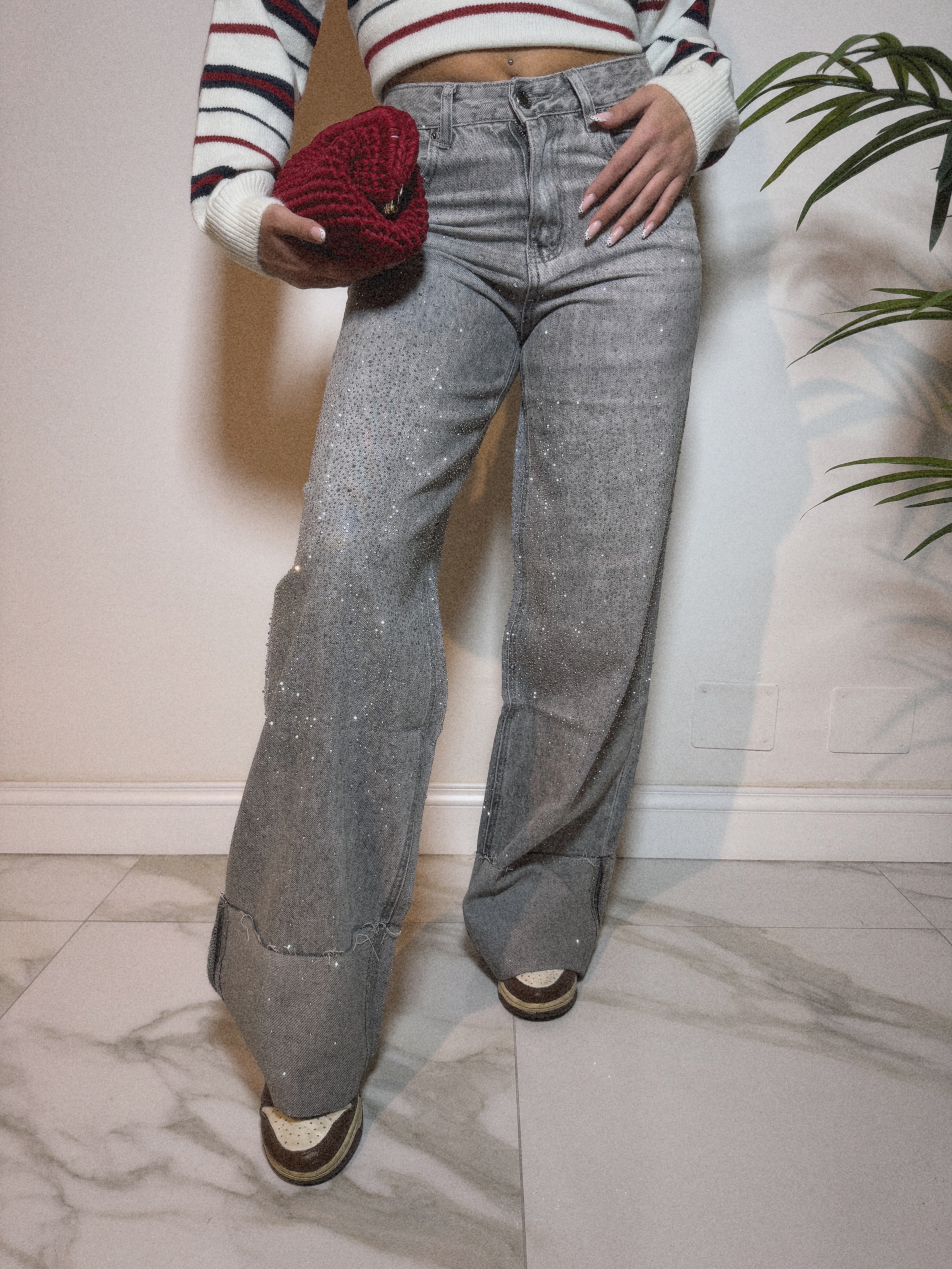Jeans Wide Leg Strass con Risvolto